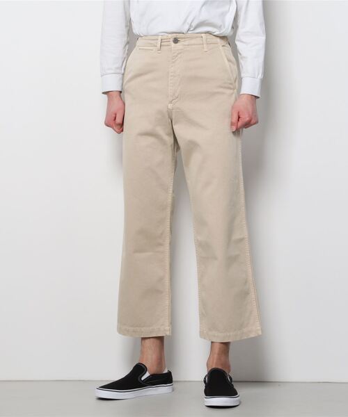 ジーンズと並ぶ人気を誇るKUROの定番チノパンツが、シルエットをアップデートして登場。通常よりも打ち込みを多くしたチノ素材で、ハリのあるしっかりとした素材感が特徴なウエストポイントチノ生地を採用。股上は深く、太もも周りも程よくゆとりのあるシルエットに。流行り廃りのない、長く着用いただける形です。硫化染めを施し適度な古着感を演出したカラーは、デニムで洗いの技術を培ったKUROならではの風合い。ブランドコンセプトである「妥協なき現代の日常着」を体現した一本です。【KURO(クロ)】「本物を着る 文化を着る 妥協なき現代の日常着」をブランドコンセプトに掲げる、東京のブランド。デニムをコレクションの軸に据え、素材やシルエット、加工など細部にこだわり抜いた日本製のアイテムを展開。ジェンダーレスなアイテムを多く取り揃え、着る人の年齢や性別に左右されない、上質なものづくりを続けている。ブランドロゴの「EST.2110」には、「常に成長を続け、100年経ってもベーシックでありたい」というデザイナーの想いが込められている。【Director / Designer】八橋佑輔 1981年生まれ、東京都出身。 独学でデザインを学び、2010年にPitti UomoにてKUROを発表。建築的アプローチと現代的な感性によるミニマルで構築的なデザイン、年間を通して日本全国の工場に足を運び、熟練した職人たちと細かく意見をぶつけ合うことで実現する、こだわりのモノづくりに定評がある。歴史と伝統が息づいた熟練の職人たちと、1からではなく、0からつくりあげることを念頭に置き創造している。そうした生産背景を経て出来上がる洋服たちは、「文化を着る」というブランドコンセプトにふさわしいアイテムが揃う。日本のファッションを牽引していく中でも常に、新しい素材の開発、洋服の新たなクリエイションの可能性、表現方法に挑戦している。