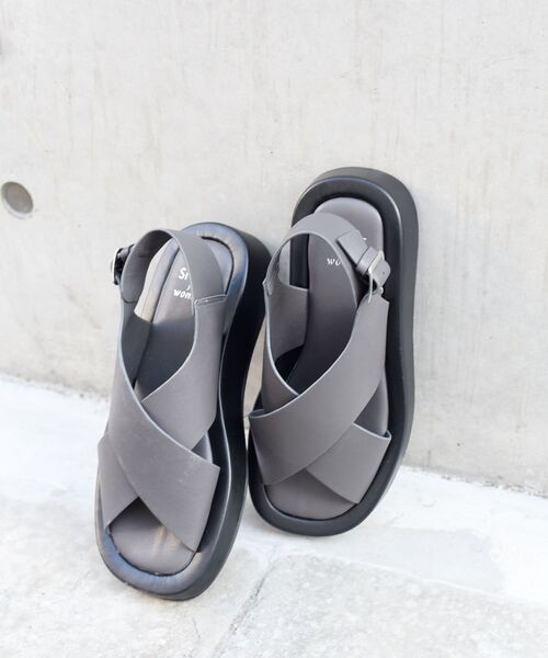 ・ボリュームのあるソールが今年らしいサンダルです。 ・存在感もありつつ、クロスデザインがすっきりと見せてくれます。 ・ベルトは調節が可能です。 ・クッション性のあるソールで疲れにくいのでデイリー使いからお出かけにもぴったりです! ------------------------------------- 【スタッフ着用コメント】 身長:165cm/体型:普通/普段サイズ:24.5/着用サイズ:38 サイズ感:普段24.5㎝で足幅は普通、38サイズを着用。クロス部分がぴたっとするので走れるくらいホールド感がありました。 コメント:ソールがしっかりめなので素足で着用しても安心感があります。 またインソールの吸い付くような履き心地が特徴的で滑ることもありませんでした。 ------------------------------------- ※サイズ換算(表記)はあくまで目安となります。 ※薄いボール紙を使用した箱の為、輸送中に箱が多少破損する場合がございます。予めご了承お願いいたします。 ※素材の特性上、若干の色ムラ、擦れが見られる場合がございますが、予めご了承下さい。 ※雨や汗に濡れた状態での摩擦により、色落ちする恐れがございますのでご注意下さい。 ※工場の生産の都合上、納期が変更になる場合がございます。発送日の前後については予めご了承ください。 ※末永く愛用頂く為に、アテンションタグを必ずご確認の上、着用又はお取り扱い下さい。