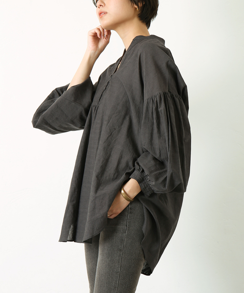 【2022SS】B.C STOCKフロント開きに釦を連ねたスキッパータイプのブラウス。柔らかな素材と袖ボリュームデザインで、腕まくりした時のふんわりとしたシルエットが可愛い一着。今年トレンドのカラー×カラーのシャンブレー素材が色の深みをだしてくれます。ご自宅で手洗い可能なイージーケアも嬉しいポイントです。**********************透け感:あり裏地:なし伸縮性:なし光沢感:なし生地の厚さ:薄手**********************【スタッフ着用コメント】《スタッフasako》年齢:30代前半/身長:153cm/体型:普通/普段サイズ: S~M/着用サイズ :フリーサイズ感:ふんわりと、余裕のあるサイズ感です。身幅も袖幅もゆとりがあるので、風が入ります。素材感:薄手の素材感で、軽い生地です。着心地:軽くて動きやすい着心地です。ふんわりと風に揺れるような薄手の素材感なので、春夏のスタイリングに活躍してくれるような、暖かい気温の時にぴったりな着心地です。**********************【スタッフ着用コメント】 《スタッフ staff.s》 身長:165cm/普段サイズ:S~M/着用サイズ:フリーサイズ感:たっぷりとギャザーの入ったリッチなボリューム感です。肩幅とアームホールも余裕のあるサイズ感なので、幅広い体型の方にお楽しみ頂けます◎ 素材感:シャンブレー生地ですがバリっとした硬さはなく、軽やかで柔らかい生地感です◎着心地: 腰周りをカバーしてくれる着丈と、ほど良い透け感、ゆとりのあるサイズ感で大満足の着心地の良さです◎キレイめにしたい日も、ラフにしたい日も、デイリーに着られる優秀トップスです。**********************※取り扱いについては、商品についている品質表示でご確認ください。※店頭・屋外での撮影画像は、光の当たり具合で色味が違って見える場合があります。商品の色味は、スタジオ撮影の画像をご参照ください。モデルサイズ:H165 採寸情報は「サイズ・詳細」をご確認ください 着用サイズ:フリー本体:手洗い可能