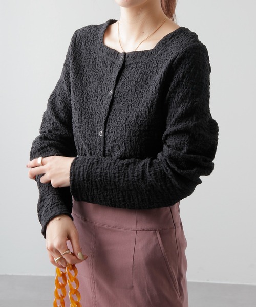 【シャーリングを施した前後2WAYトップス】釦を前でも後ろでも表情を変えて着られる前後2WAYデザインのトップス。前開きでカーティガンとしても、ボタンをとめてプルオーバーとしても着用可能です。しわ感を強めに入れて立体感のある表情に仕上げました。シルエットはスリムラインを描く様に、細身ですっきり着用出来るシルエットに。コンパクトな着丈バランスでどんなボトムスとも相性良く、さまざまなコーディネートが楽しめるアイテムです。・Vネックとクルーネックの前後2WAYで着用可能・シルエットにこだわった立体感のあるシャーリング加工・ボトムスを選ばず幅広くアレンジ可能【コーディネート】キレイめからカジュアルまで幅広くマッチするデザインなのでデニムなどのカジュアルなボトムからタイトスカートなど、女性らしいスタイリングに◎レザーやスエード素材のボトムと合わせれば、旬なコーディネートの完成です。足元はスニーカーなどラフなスタイリングやローファーやブーツなどでクラシックにコーディネートするのもオススメです。プルオーバーとしてもカーディガンとしても使えるから1枚で着こなしの幅がぐっと広がります。■素材・洗濯について素材:綿67% ナイロン31% ポリウレタン2%洗濯:洗濯機使用可(弱・ネット使用)着用スタッフ 160cm※着用、お取り扱いの際は、商品についている品質表示とアテンションタグを必ずご確認下さい。※商品タグに記載されている商品名がWEBでの表記名と異なる場合があります。※画像の商品はサンプルです。実際の商品と仕様、加工、サイズが若干異なる場合がございます。 ※照明の関係により、実際よりもやや明るく見える場合がございます。またパソコンなどの環境により、若干製品と画像のカラーが異なる場合もございます。予めご了承くださいませ。 【お気に入り登録】してお得な情報をCHECK!!・「商品のお気に入り登録」で再入荷通知や、ラストの通知、セール通知も受け取ることができます。・「ブランドのお気に入り登録」で新商品や再入荷など、お得な情報を受け取ることができます。