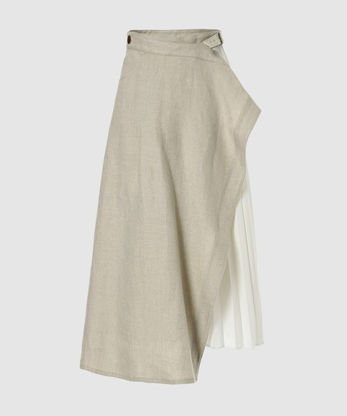 EZUMi 2010年にデザイナーの江角泰俊が「ヤストシ エズミ(YASUTOSHI EZUMI)」として立ち上げたブランド。 ブランドコンセプトには「理/LOGIC」を掲げる。 2022年春夏ウィメンズコレクションは、 現代美術作家・杉本博司と建築家の榊田倫之による著書『Old Is New 新素材研究所の仕事』にインスパイア。 “古いものこそ新しい”という概念のもと、 伝統的な素材で新たな建築を生み出していく価値観や姿勢に着想を得ている。 左右非対称ながらも均整のとれたフォルムのアシンメトリーデザインスカート。 均一に並ぶプリーツと、流れるようなドレープを描くデニムが 対比を見せつつ調和している。