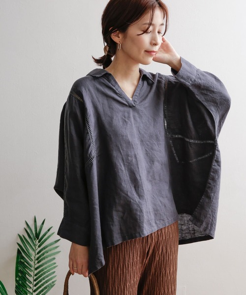 抜け感のあるオーバーシャツのショルダーや脇にライン状のレースを組み合わせ、大人ナチュラルなアイテムに仕上げた一着。 着込むほどに風合いの生まれるリネン100%の生地を使用し、くたっとした柔らかい肌触りが心地良いため気温がしっかりと上がってからでも涼しげに着ることができます。 腰までかかる着丈は体型カバーにも一役買い、合わせるボトムスデザインも選びません。 ルーズシルエットながらもスキッパーネックがスッキリとした印象で、甘さを抑えた3色も大人の雰囲気になっています。 【シリーズアイテム】 DR25-23E109 リネンVネックチュニックブラウス DR25-23E110 リネンバルーンスリーブブラウス DR25-23M208 リネンバックタックシャツ DR25-23M107 リネンワイドシャツ DR25-26M105 リネンギャザーワンピース ※この商品は麻素材を使用しております。その為、ネップ(部分的に太くなっている)やスラブ(太さにムラがある)などの糸ムラは、麻の素朴さを活かしたものです。また素材の特性上、シワになりやすいのでご注意ください。 ※この商品は、色の特性上、直射日光や蛍光灯に長時間あてますと変色する恐れがございます。ご着用や保管の際は、充分ご注意ください。 ※商品画像は、光の当たり具合やパソコンなどの閲覧環境により、実際の色味と異なって見える場合がございます。予めご了承ください。 ※商品の色味の目安は、商品単体の画像をご参照ください。 ▼お気に入り登録のおすすめ▼ お気に入り登録商品は、マイページにて現在の価格情報や在庫状況の確認が可能です。 お買い物リストの管理に是非ご利用下さい。 ----------------------------- 透け感:ややあり 伸縮性:なし 裏地:なし 光沢:なし ポケット:なし -----------------------------