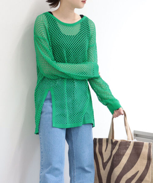 ◇fredy emue◇【2022 SS】透かし編み メッシュプルオーバー●point・ざっくりとしたメッシュの透かし編みがナチュラルな風合いのニット・リラックス感あるチュニック丈とゆるっとしたフォルムがこなれた印象に・フロントに施したスリットが軽さと野暮ったくならないすっきり見えをプラス●detail・ゆったりた身幅とお尻の隠れる丈感でボトムスを選ばず着回しのしやすいサイジングに・春夏シーズン快適に着やすい、レーヨン・ナイロンのさらっとした肌ざわりも魅力・ロンTやキャミソールなど様々なアイテムとのレイヤードスタイルが楽しめます・ナチュラルなキナリ、コーデに映えるグリーンやモードライクなチャコールグレーのカラー展開透け感:あり裏地:なし伸縮性:ややあり光沢感:なし生地の厚さ:やや薄手洗濯:手洗い可●coordinateロゴTシャツやシャツワンピースとのレイヤードスタイルや、キャミソールと合わせたヘルシーなスタイルなどインナー次第で表情の変わるアイテム。インナーは同色でまとめるのがおすすめです。ボトムスのカラーを合わせたワントーンコーデでより大人な抜け感あるスタイリングがきまります◎●お取扱い上のご注意●*商品を長くご愛用していただきたいため、アテンションタグを必ずご確認の上、着用又はお取り扱い下さい。*店頭及び屋外での撮影画像は、光の当たり具合で色味が違って見える場合があります。商品の色味は、スタジオ撮影の画像をご参照下さい。*商品画像に関しては出来る限り忠実に表示出来るよう努めておりますが、お客様がご利用のモニターの設定及び特性により、実際の商品と比較し色味に若干の誤差が生じる場合があります。◇商品のお気に入り登録◇【お気に入りに登録 ♡マークをクリック!】を是非ご活用ください。 再入荷の通知や、ラスト1点の通知、セールの通知がいち早く届きます。 ◇ブランドのお気に入り登録◇新商品や再入荷など、いち早くブランドのお得情報が届きます。