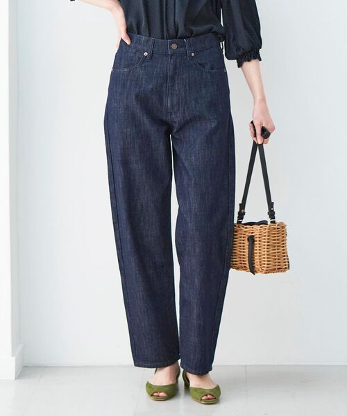 【今年らしいビンテージ感】 この春注目のリーバイスや古着のようなコットンデニム。 ハイウエストのデニムパンツは、カーブがかったテーパードシルエットが今年らしい1枚。 カジュアルなアイテムですが、前身頃が小さめの設計でスッキリとした印象で着て頂けます。 ドットボタンなどの金具部分は赤みのアンティークゴールドでビンテージライクなムードに。 ベルト裏のブランドネーム刺繍もさりげないポイントです。 一般的なコットンデニムは12ー14ozが多いですが、メンズライクになりすぎずに軽く着れる10ozを使用。 加工感のあるブルーと、ワンウォッシュできれいめ仕上げのネイビーの2色展開でご用意しました。 ※同素材でスカートの展開あり。(3023046600 デニムストレートスカート) ※デニム生地の「oz(オンス)」とはデニム生地の重さを表す単位のことです。 ==================== 透け感:なし 裏地:なし 伸縮性:若干あり 光沢感:なし 生地の厚さ:普通 ====================