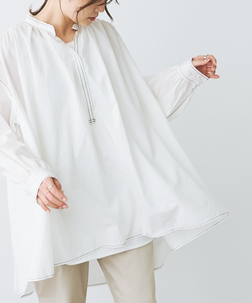 ピュアルセシン 2022 spring collection【Loose and classical】 ◇ほのかな光沢で綺麗見え。大人女性におすすめのチュニックブラウス◇ ●デザイン たっぷり取った身幅と大きくつけた前後差により、動きが出るブラウス。 チュニック丈なので、ヒップ周りも安心です。 シンプルなデザインですが、配色のステッチを施すことでディテールを引き立て、良いアクセントに。 バックはキュッと寄ったギャザーからふわりと広がるフレアシルエットで、綺麗なドレープを生み出し、洗練された雰囲気を作り出します。 生地にテンセルを混ぜることで艶ととろみが加わり、大人女性でもお召しいただきやすい1枚に仕上げました。 ●カラー展開 ベーシックなシロ、クロの他に、爽やかなライラックの3色展開です。 ●素材 コットンテンセルで肌なじみの良い生地感です。柔らかく、滑らかな質感です。 ●スタイリング たっぷりシルエットなので、ボトムスはスッキリしたものがオススメ。 カジュアルなリブパンツやジョガーパンツ、綺麗見えするスリットパンツやデニムパンツなど様々なスタイリングをお楽しみいただけます。 =============================== 透け感:ホワイトのみややあり 裏地:なし 伸縮性:なし 光沢感:ややあり 生地の厚さ:普通 【スタッフコメント】 年齢:20代前半/身長:157cm/普段着用サイズ:Mサイズ サイズ感:たっぷりした身幅なので、身体のラインを拾いません。またノーカラーなので顔周りをすっきりと魅せてくれます。 素材感:さらりとした軽やかな素材感です。 =============================== ※撮影場所やお使いのモニター環境により若干お色味が異なる場合がございます。特にロケの撮影では明るく見える傾向にございます。 ※予約商品はサンプルで撮影をしております。若干の仕様が変更になる場合がございますので予めご了承の上ご注文くださいますようお願いいたします 。