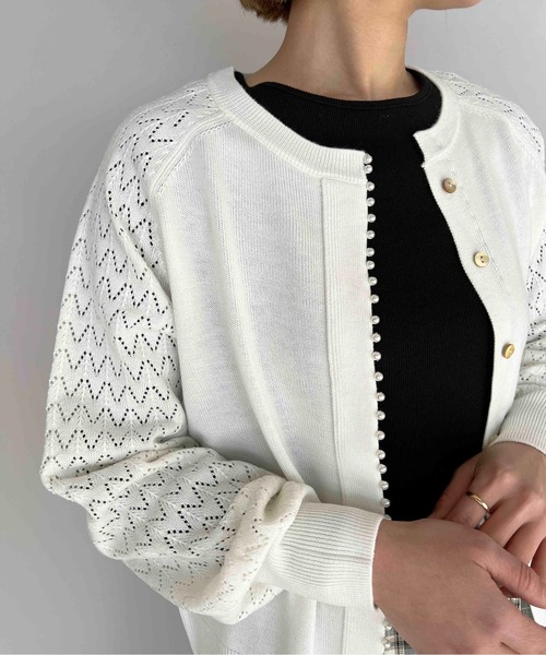 フロントのパールがアクセントのカーディガン。袖は透け感のある編地になっており、春らしい軽やかさをプラスしました。透け感のある編地とパールで、華やかさのある上品な一枚に仕上げました。キレイめ、フェミニン、大人カジュアル、オフィスカジュアルと幅広いテイストに活躍するアイテムです。model:H164 着用サイズ:M※撮影場所や明るさにより実際の商品と色味が若干異なる場合がございます。 ☆商品のお気に入り♡登録を押せば”再入荷通知”や”残りわずか通知” 値下げのお知らせが届きます!お気に入りのブランド登録していただければ新商品入荷のお知らせも届きますので是非登録してみて下さい。