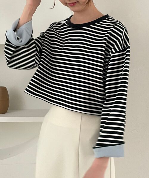 定番のボーダーに袖部分の切替しカラーでアクセントを加えたカジュアルライクなトップス☆ 程よく厚みのある生地で仕立て、幅広シルエットにコンパクトなショート丈でトレンド感を演出! デニムはもちろん、ワンピースとのレイヤードスタイルでキュートな着こなしも楽しめます♪