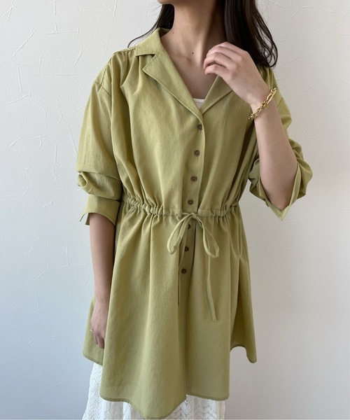 ーーー ヒップや腰回りもカバーできる開襟ドロストシャツ ーーー 【デザインと特徴】 お家で洗えるイージーケアが魅力的な、開襟ドロストシャツです。 ドライタッチの素材感なので夏まで使えます。 フロントショルダーにもギャザーが入り、ボリューム感を調整することができ ボタンを開けて羽織りとしても◎ ヒップかかる丈で今年もたくさん使えそうです。 【素材特徴】 去年の夏に好評だった開襟ドロストシャツのお家で洗える同じ素材で 長袖バージョンを作りました。 乾きが早い生地なので夏にむけてぴったりです。 ポリエステルでしわになりにくく、軽さもあり速乾性とシアー感が 夏に向けてぴったりの素材です。 ドライタッチの質感が涼し気に着て頂けます。 太い糸と細い糸の変わり織りがおしゃれです。 【洗濯可否】 手洗いでの処理が行えます。 【スタイリング】 ナローシルエットスカートや、パンツにも合わせやすいアイテムです。 タイトシルエットと合わせてもボリュームがでてこなれ感がでるのでおすすめです。 前はぎゅっとリボン結びをして着ると女性らしさがプラスされます。 ※屋外の光や照明の当たり具合で、実際の商品の色味とカラー別画像の色味に違いが発生する場合がございます。 商品の色味はスタジオ撮影の詳細画像にてご確認ください。