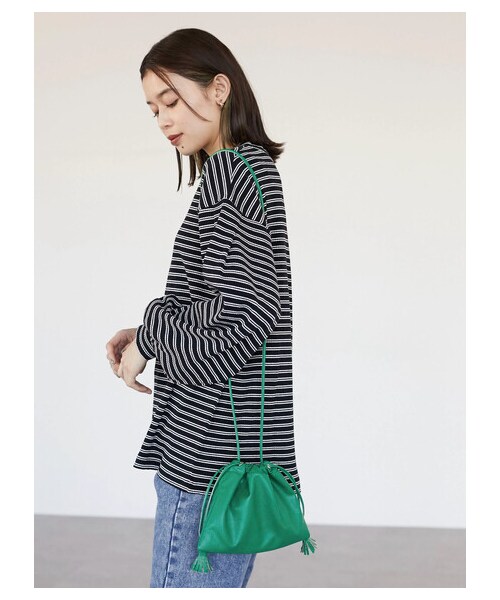 さりげなく揺れるフリンジがアクセントのフラット巾着。つやのあるフェイクレザーで上品に仕上げました。 スマホや小物類を収納できる小ぶりのサイジングに、華奢で長めのハンドルがカジュアル感を抑えきれいめデザインに◎。さっと肩にかけるだけでこなれ感を演出できます。