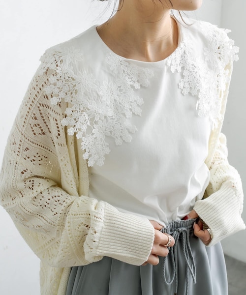 ピュアルセシン 2022 spring collection【Loose andclassical】リラックス感のあるルーズな着こなしや、今シーズンらしいミニマムでユーティリティな要素と素朴かつ巧みなハンドクラフト的なものとの融合させたスタイリングの提案◇華やかなスタイリングに仕上がる、レース襟インナー◇●デザインコーディネートの+1アイテムとしてお召しいただけるレース襟インナー。メイン地とレースを同色にすることにより、甘さが抑えられ幅広いスタイリングに取り入れやすいデザインに仕上げました。伸縮性のある生地はストレスフリーな着心地。ノースリーブなので半袖から長袖まで、ロングシーズンお召しいただける1枚です。●カラー展開定番のオフホワイト/ブラックの2色展開●素材メイン地はコットン100%の柔らかな素材。伸縮性があり、サラリとした肌あたりです。●スタイリングラウンドネックやボートネックなど、ネックラインに余裕のあるトップスと重ねて、スタイリングの変化をお楽しみください。レースをあしらうことでシンプルなトップスも華やかな印象に仕上げてくれます。===============================透け感:オフホワイトのみややあり裏地:なし伸縮性:あり光沢感:なし生地の厚さ:普通【スタッフコメント】年齢:20代前半/身長:157cm/普段着用サイズ:Mサイズサイズ感:身幅、肩回りなどしっかり余裕があるので、締め付け感なく着用が出来ました。素材感:さらりとした軽やかな素材感です。伸縮性があり、なめらかな着心地です。===============================※撮影場所やお使いのモニター環境により若干お色味が異なる場合がございます。特にロケの撮影では明るく見える傾向にございます。※予約商品はサンプルで撮影をしております。若干の仕様が変更になる場合がございますので予めご了承の上ご注文くださいますようお願いいたします 。