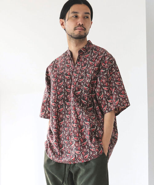 手仕事プリントによる都会的なプルオーバー 落ち着いたペイズリープリントが印象的な半袖シャツ。インドの伝統技法「ブロックプリント」により全ての工程を手作業で仕上げています。襟のデザインには開放的なスタンドプルオーバーとシルエットには現代的なリラックスシルエットを構築。またさらっとした清涼感を感じられる素材感もポイントです。※手作業の為、部分的に濃淡があります。