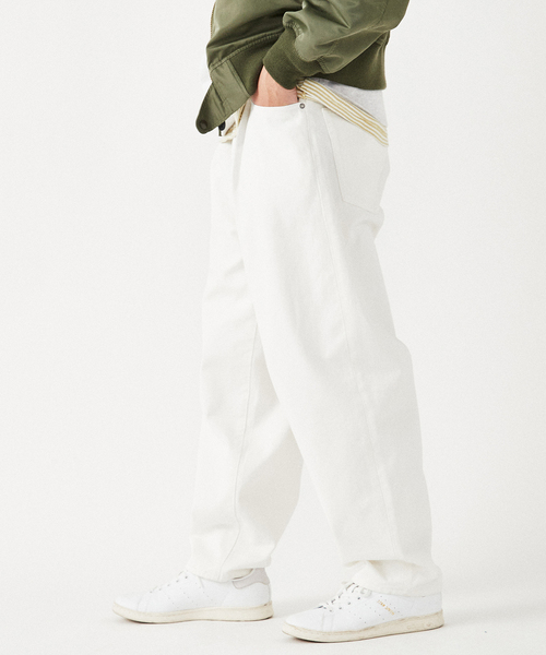 ワイドシルエットで裾にかけてテーパードしたフロントに1タックが入った12ozのデニムパンツ。太めが苦手な方でもスッキリ着れるシルエットが特徴です。立体感のあるユーズド加工をしているので使い込まれたような風合いになっています。また、ベルト裏に商品名を刺繍していたりと見えない細部までこだわりが行き渡ったアイテムです。**********************透け感:なし裏地:なし伸縮性:なし光沢感:なし生地の厚さ:普通**********************【スタッフ着用コメント】《スタッフA》身長:183cm/体重:74kg/普段サイズ:XL/着用サイズ:Lサイズ感:大き目な作りなのでウエスト周りはジャスト、ほどよくワイドシルエットが映えます素材感:風合いのあるデニム素材着心地:ほどよい厚みと加工により柔らかく履きやすいです**********************【ご注意】※商品の色味につきまして、お客様のお使いのPCのモニター環境により実際のカラーと画像の色味が違って見える場合が御座います。予めご了承の上、ご注文下さい。※店頭・外での撮影画像は光の加減で、実際の商品より明るく見える場合が御座います。商品の色味はスタジオ撮影の画像を参考にして下さい。本体:洗濯機洗い(弱)、インディゴ染め製品