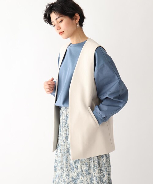 1着でハンサムに映える合皮ベスト 【素材】 柔らかくストレッチ性のあるシンセティックレザー(合成皮革)を使用。 リアルな表情のシンセティックレザーなので、上品な仕上がりに。 ※裏地あり ※ポケット数:横×2 【デザイン】 今年らしいトレンドのVネックの羽織タイプのベスト。 着るだけで旬なスタイルになり、パンツでもスカートでも合わせやすいミドル丈。 こちらの商品は主に春に着用いただける商品です。 モデル情報:身長163cm B80 W60 H89 着用サイズ:38(M) 店舗へのお問い合わせ商品番号:637-44014 ●製品寸法: 38(M):着丈69cm B94cm 肩幅35cm 40(L):着丈72cm B96cm 肩幅35cm 備考:重量:38(M)約385g