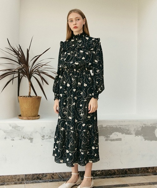 ネックと袖、ウエストのディテールがポイントのプリントマキシワンピースです。ウエストのスッキリとシルエットで細く見えます。