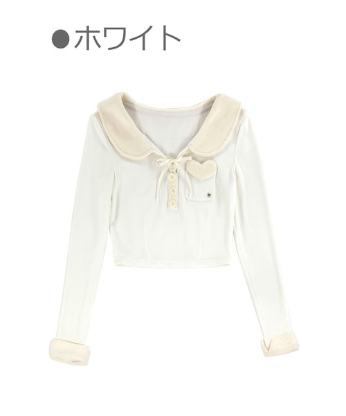 起毛素材をMIXしたラウンド襟&折り返し袖口 胸ポケットのハート型や衿元のレースアップ 散りばめられたアイコニックなデザインは 冬から春へのシフトを物語るみたい 今季トレンドのハイウエストなボトムスに 合わせられるスリム見えショート丈トップス ちょこっとウエストの肌見せがヘルシーだよ 「ホワイト」「黒」「ピンク」の3色展開
