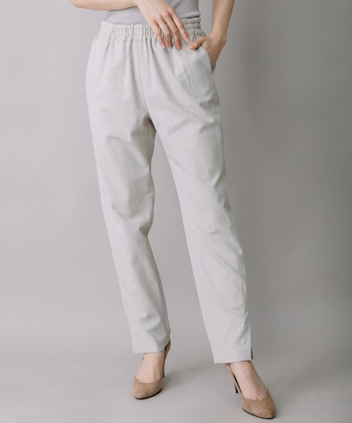 □ 2022 SPRING & SUMMER COLLECTION □◆ カジュアルでも程よくキチンと感のある1枚あると便利なテーパードパンツ◆<MATERIAL>ロングヒットのシェルタリングドライオックス素材です。ナチュラルな表情から想像できないようなたくさんの機能を備えた素材で、光の透過を抑える異形断面の原糸を使用しているため白や淡色でも透けにくく身体に沿ったボトムでも裏地無しで安心して着用できます。吸水、速乾性にも優れているので中肉厚でも真夏を快適に過ごせます。加えてポリエステルがメインの混率なのでしわになりにくいというメリットもあります。麻を加えることにより清涼感と凹凸のある組織に織り上げて、染色の前後2回タンブラーにかけてよりカジュアルな風合いに仕上げています。<DESIGN>裾脇にベントあきをつけた、ややゆったり目シルエットのテーパードパンツです。ドライオックスの特性を一番活かせるのがパンツで、春先から晩夏まで長く使えます。カジュアルでも程よくキチンと感を備えていて、リネンの質感がありながら1日中穿いていてもひざやわたりにしわが残らずキレイなままで過ごせます。吸水・速乾性のある素材を使用しているので、汗ばむ時期でも快適に穿いて頂けます。アンクルレングスで穿くのが一番おすすめですが、少し長めで穿いてもベントが開くため甲、かかとで溜まりにくいためシルエットを崩さずきれいに穿くことができます。ウエストベルトは細幅のゴムと紐仕様になっており、穿き口がソフトなので快適な穿き心地で、ウエスト調整が可能になります。<COLOR>■ホワイト:ぱりっとクリアな印象のホワイト。爽やかで春夏シーズンらしいイメージに。■ブラック :凹凸のある組織ならではの、重たくなりすぎずさっぱりとしたイメージのブラック。■ナチュラル:天然の麻のような明るめのナチュラルカラー。大人っぽくこなれたイメージで着こなせそうです。■ダークベージュ:深めのダークトーンのシックなベージュ。横糸に淡いブルーの糸が使われており、おしゃれなニュアンスのある一枚です。■グリーン:トレンド感のある黄味がかった鮮やかなグリーン。同素材のパンツとのセットアップはもちろん、モノトーンコーデの差し色としても活躍しそうです。■イエロー:ぱっと目を引く明るいイエロー。透けにくい素材なので気兼ねなく着られる一枚です。*光のあたり具合いやパソコンなどのモニター環境によって実際の色味と異なって見える場合がございます。予めご了承ください。<SIZE>■普通体型157cmのスタッフはXSサイズを着用しています。■普通体型160cmのスタッフはSサイズを着用しています。■165cm以上でもやせ形の方はSサイズで問題なく穿けますが、骨盤がはっていたり、長めの丈感がお好みの方はMサイズをおすすめします。※ウエストは3cmずつ大きくなり、丈は2cmずつ長くなります。*お取扱いについては、商品についております品質表示にてご確認ください。洗濯機洗い可.............................≪INFORMATION ≫.............................▼商品のお気に入り登録▼『♡』マークを押してお気に入り登録して頂いた商品は、セール開催の通知やクーポン発行などのキャンペーンなど、お得な情報をいち早く受けとる事が出来ますので、ぜひご登録ください。