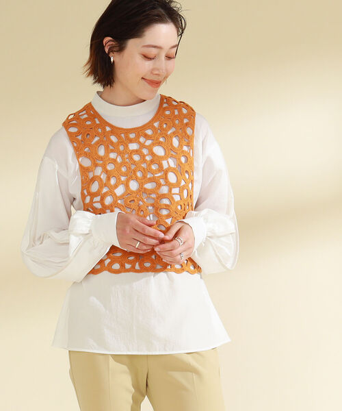 プラスワンでおしゃれを取り入れて1枚ずつのパーツをかぎ針風刺繍機により作成し、丁寧に接ぎ合わせたハンドメイド風のニットベスト。連なる泡のような柄をバランスよく仕上げた、<Ray BEAMS(レイ ビームス)>らしいこだわりが詰まったひと品です。シンプルなデザインながらTシャツやタンクトップ、キャミソールなどと合わせることで、旬なコーディネートに◎。同素材を使用したパンツ(品番: 61230944597)とのセットアップもおすすめです。Model:H170 (cm) Size:ONE SIZE