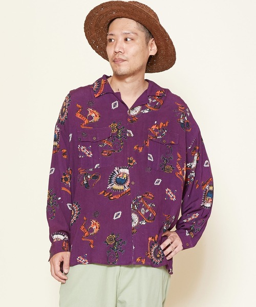 サンフェイスやベアパウなど、ネイティブアメリカンのモチーフ・シンボルをヴィンテージ調カラーで表現、プリントしたオーバーサイズの開襟シャツ。いつもと違う自分に出会える一枚。<モチーフの意味>●サンフェイス【SUNFACE】父なる太陽。生命力・成長を司る万物の創造主。●ベアパウ【BEAR PAW 熊の手・足跡】大地に刻まれる動物の足跡は、そこの自然が豊かであることの表れ。実りの豊かさや大地のパワーの象徴。良いことの前兆も意味します。※こちらの商品は1点1点職人による手作りとなります。その為、生地の取り方により柄の配置や形・色合いなど若干異なる場合がございます。(画像は一例です。)あらかじめご了承ください。※屋外での撮影画像は、光の当たり具合で色味・カラーが違って見える場合がございます。商品のカラーは、スタジオ撮影の画像をご参照ください。Amina Collection Co.,LTD.