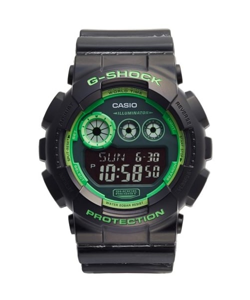 Bold resin gives a boost to this head-turning watch that looks great at the gym or paired with casual ensembles, while offering both shock- and water-resistance. The large digital face is fully functional with daily alarms, world time, stopwatch and countdown timers, and an LED backlight. 55mm case; 22mm band width. Buckle closure. Quartz movement. Water-resistant to 20 ATM (200 meters). Mineral crystal face. Resin/stainless-steel caseback. By G-Shock; imported. Packaged in a white square watch box.