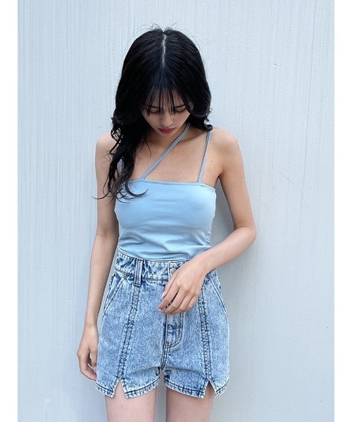 ストラップが3本ついており中心のストラップを斜めにして着用してアレンジができます。 バックが開いたデザインのインナーにコーディネートするのがおすすめです。 ※取り外し可能なパッド付き