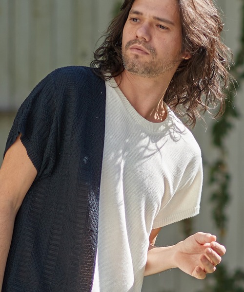 175cm B90-W73-H89 靴26.5cmのモデルがMサイズを着用。 ワッフル編みと柄編みで編み組織に変化を加え切り替えたニットTシャツ。 編地の変化に加え、配色にすることでシンプルながらギミックの効いたデザイン。 あえて袖丈を短めに設定し、スッキリとしたフォルムデザイン仕上げました。 ※着用画像と商品単体画像で色が異なる場合がございます。 ※商品単体画像を実物により近づけております。