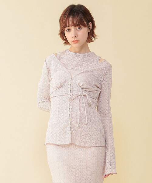 【ar8月号】 【女性らしい着こなしに仕上がる総レーストップス】 ♡Design Point♡ 同素材のノースリーブトップスと カーディガンがセットになった、 大人フェミニンな総レースのセットアイテム。 ノースリーブトップスはネックラインが詰まった デザインで、バックの涙あきがポイント。 カーディガンは広めにカットしたVネックと 身体に沿ったシルエットが女性らしいデザイン。 フロントに並んだマーブル調のボタンが アクセントになっています。 ♡Fabric Point♡ 繊細な折り柄が施された、伸縮性のある レース生地を使用。 着回しの効くフェミニンなカラー展開が魅力♡ ピンクベージュはオリジナルカラー。 透け感:あり 裏地:なし 伸縮性:あり 光沢感:なし ♡Styling Point♡ 同シリーズのスカート (120110042 レースロングスカート) と合わせたSET UPスタイルもおすすめ♡ レイヤードスタイルで着用する際は、 カーディガンの肩を少し落として肌見せするのが おすすめの着こなしです。
