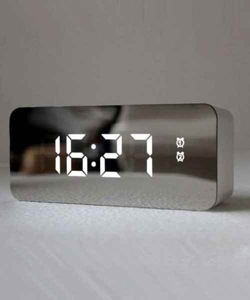メタル LED デジタル 置時計 スタイリッシュなデザインでインテリアにもぴったりなメタルデジタル置き時計♪ボタンを押せば点灯し暗闇でもしっかりと時間や気温、日付が分かるので寝室にぴったりです!通常時は鏡のように反射しキラリと輝き点灯時とはまた違った雰囲気をお楽しみ頂けます♪引っ越し祝いなど新生活の贈り物にぴったりな時計となっておりますよ♡この機会に是非オシャレな時計で毎日を過ごしてみて下さいね! 取り扱い説明書 □電力供給は2種類。 付属のプラグのみでの供給では、画面が常時点灯。 (時間・アラームのバックアップ無し) 電池のみでの供給では10秒で画面が消灯。 いずれかのボタンで再点灯。 (時間・アラームのバックアップ有) プラグ+電池での供給では、画面は常時点灯 (時間・アラームのバックアップ有) □MODEで表示切替 時間→日付→温度→※省エネモードON/OFF (※画面の輝度が下がります。) □ALARMでアラーム時間表示 さらにALARMでアラームのON/OFF ■時間画面でMODE長押し 時間設定 12/24設定→時→分 (UP/DOWNで設定、MODEで次項目に移ります。) ■日付画面でMODE長押し 日付設定 西暦→月→日 (UP/DOWNで設定、MODEで次項目に移ります。) ■温度表示でMODE長押し 表示設定(切り替わるとピっと効果音が鳴ります。) 常時時間表示→自動で表示が変わる切り替え表示 ■ALARM長押し(ALARMでアラームのON/OFF) 時→分→鳴っている時間→※モード ------------------ ※モード 1-5は月~金曜日 1-6は月~土曜日 1-7は毎日 ------------------ (UP/DOWNで設定、ALARMで次項目に移ります。) ※電池式単4形3本またはUSBで繋いでご使用ください。 ※撮影・モニター環境等により実際の商品の色味と異なって見える場合がございます。 〈商品のお気に入り登録〉 お気に入りの登録をして頂きますと セールの通知・ラスト1点になった時の通知や、再入荷通知を受けることができます♡ 〈ブランドのお気に入り登録〉 新商品の発売や再入荷、タイムセールやクーポン発行のお知らせなど お得な情報を受け取ることができます。