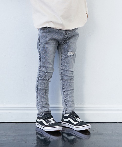 脚長効果があるきれいなシルエットのスキニーパンツです。 カジュアルなデニム素材にダメージ加工をほどこし、こなれた仕上がりに。春らしい淡いサックスと、かっこいい着こなしができるグレーの2色展開です。ウエストはアジャスターゴムでサイズ調節可能。内側にはお名前を記入できるタグつきです。【透け感】透けない※サックスで確認【生地の厚さ】普通【伸縮性】あり【裏地】なし【ポケット】あり【アジャスター】あり