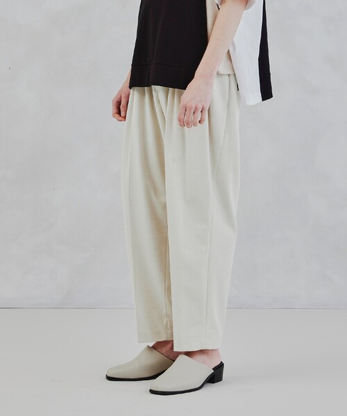 【素材】 リネンのような風合いでサラッとした肌当たりが特徴のツイル素材を使用。 ※裏地なし ※アイボリー(704)は透け感があるため、インナーの着用をおすすめします。 【デザイン】 タックの多さが個性を演出するスラックス。 インバーテッドプリーツが3本入ったことでタックが多く入っているように見えるのが特徴のデザイン。 腰から裾にかけて程よくテーパードしていることで上品な印象をプラスするシルエットです。 ※ポケット数:横×2、後ろ×2 【スタイリング】 リネンライク5分袖ショートジャケット(商品番号:170-44504)とのセットアップスタイルがオススメです。 同素材で統一されたスタイリングはクリーンな印象になります。 シャツなどのアイテムをタックインする着こなしもオススメで、モードかつタックのインパクトを強調でき今季オススメです。 - BRAND CONCEPT - 時代を超えて支持されるトラディショナルなアイテムをベースに、アソビ心とストリートの自由な発想を取り入れ、日本独自のミックススタイルを提案します。 こちらの商品は主に夏に着用いただける商品です。 モデル情報:身長175cm B83 W66 H87 着用サイズ:03(L) 店舗へのお問い合わせ商品番号:170-74205 ●製品寸法: 02(M):W72cm H138cm 股下68cm 前股上32cm 渡り幅36cm 裾幅20cm 03(L):W76cm H142cm 股下70cm 前股上32cm 渡り幅38cm 裾幅20cm 66(WOMENS FREE):W68cm H130cm 股下66cm 前股上31cm 渡り幅35cm 裾幅19cm 備考: