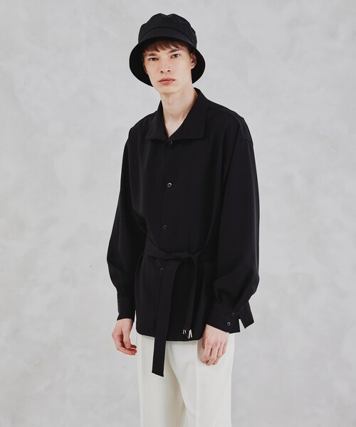 【素材】 ポリエステルながらも、リネンのようなナチュラルさを感じられるウエザークロスを使用。 リネンよりも耐久性があり家庭での洗濯もできるため、普段使いしやすい素材です。 ※裏地なし ※ホワイト(001) ライトブルー(091)はやや透け感があるため、インナーの着用をおすすめします。 【デザイン】 トレンチコートのようなベルテッドデザインが特徴的なシャツ。 程よくゆとりのあるサイズ感にベルトを締めることで美しいドレープ感が出ます。 フロントのボタンも大きなものを使用しており、アウターのようにお使いもしていただけます。 ※ポケットなし 【スタイリング】 スラックスなどのパンツと相性が◎ クリーンな印象はありつつもモードな雰囲気を演出できます。 また、羽織るタイリングとしても、お使いしていただきやすく、ショート丈のトレンチコートのように気楽なスタイリングにマッチします。 - BRAND CONCEPT - 時代を超えて支持されるトラディショナルなアイテムをベースに、アソビ心とストリートの自由な発想を取り入れ、日本独自のミックススタイルを提案します。 こちらの商品は主に夏に着用いただける商品です。 モデル情報:身長175cm B83 W66 H87 着用サイズ:88(FREE) 店舗へのお問い合わせ商品番号:170-84104 ●製品寸法: 66(WOMENS FREE):着丈70cm B120cm 袖丈55cm 肩幅54cm 88(FREE):着丈75cm B132cm 袖丈61cm 肩幅58cm 備考:重量:約335g(サンプル重量)