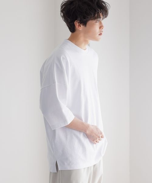 ◇素材 USAコットンで編み、しっかりとした生地感に仕上げました。 タフな質感ながらも、着るほどに体に馴染んできて風合いも増してくる素材です。 ◇デザイン トレンド感のあるドロップショルダーのハーフスリーブで、 ゆったりとしたリラックス感のある着こなしが楽しめます。 また、肩回りをドルマンスリーブ風にアレンジし、 シンプルなデザインですが、丸みのあるシルエットが様になるアイテムです。 ◇スタイリング オーバーサイズでゆったりとした着心地の定番アイテムなので、 ボトムはカジュアルなデニムや、細めのテーパードパンツ合わせも◎。