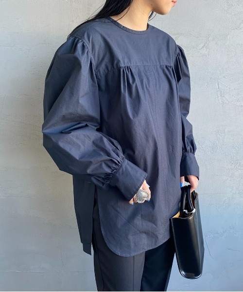 程良いハリ感が上品見えするコットンブラウス< デザイン・シルエット >●シンプルなプルオーバータイプのロングスリーブシャツブラウス●ボトムを選ばないプレーンなデザインがポイント●ヨークや肩・袖口に細かなギャザーを配し、ふんわりと柔らかなボリュームのあるシルエットに●ネックラインをすっきりと見せてくれるノーカラー仕様●たっぷりとふくらみを持たせたボリュームスリーブが特徴的●抜け感漂う深めのサイドスリット入りで、前だけタックインするなどひねりの効いたコーディネートが楽しめます●軽やかな動きが出るラウンドヘムデザイン●ボタンが見えない比翼仕立てのバックデザインがモードな雰囲気で、後姿もサマになります●ワイドパンツやスカートでレディライクに着こなしたり、デニムやチノパンでカジュアルダウンさせても◎●通勤時などのデイリーにはもちろん、卒・入学式など春のイベントでも着用しやすいアイテムです< 素材 >●上品かつクリーンな表情の綿100%素材を使用●程良いハリ・コシがあり、きちんと見えも叶う一着です●やや透け感のある涼しい着心地で、春夏の装いにぴったり【THE SHINZONE/ザ シンゾーン】“デニムに合う上品なカジュアルを提案”をコンセプトに展開しているブランド。東海岸のアイビーやプレッピーをベースに、旬なベーシックアイテムを現代のムードでブラッシュアップした上質なリアルクローズが魅力です。★お買い物をよりお楽しみ頂く為にお気に入り登録がおススメです!▼商品のお気に入り登録商品ページ内のハートマーク♡をクリック。完売時の再入荷や、最後の1点の通知、お得なお値下げの通知を受ける事ができます。 【お知らせ】ページでも通知が確認できます。 ▼ブランドのお気に入り登録新商品や再入荷など、いち早くブランドのお得な情報を受け取ることができます。