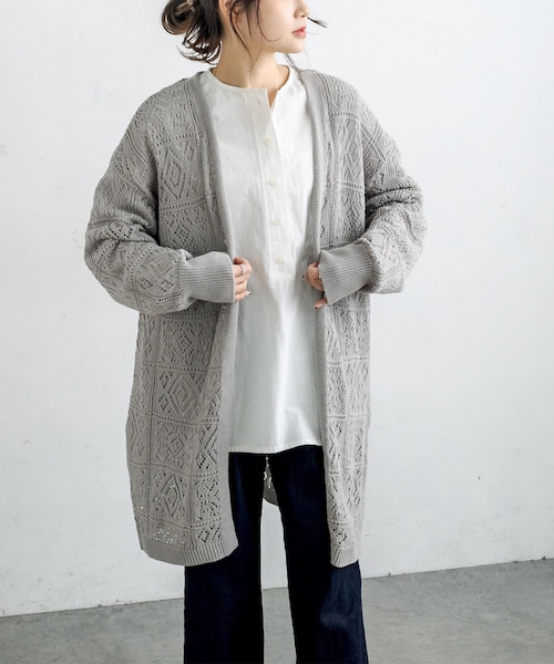 ピュアルセシン 2022 spring collection【Loose andclassical】リラックス感のあるルーズな着こなしや、今シーズンらしいミニマムでユーティリティな要素と素朴かつ巧みなハンドクラフト的なものとの融合させたスタイリングの提案◇クラシカルな雰囲気を気軽にONできるカーディガン◇●デザイン程よい太さの5Gの糸を使用した透かし編みニットカーディガン。2種類の繊細な編み柄を組み合わせたことでスクエアのラインが生まれ上品な印象の透かし柄が完成しました。裾と袖口にはリブを施しフロントはボタンレスでガウンタイプ。ロング丈ですが、サイドに深めのスリットを入れているのでパンツスタイルから、ワンピース、スカートスタイルまで様々なスタイルに馴染むシルエットです。●カラー展開アイボリー、ベージュ(グレイッシュベージュ系)、ブラック●素材コットンとアクリルの混紡糸を使用したやわらかい肌当たりのニット素材です。透かし編みなので半袖カットソーやシャツの上に羽織って、初夏まで着られる素材感です。●スタイリングカジュアルなカットソーとパンツのスタイリングに羽織るだけで、上品な印象にまとめてくれるカーディガンです。ワイドパンツとコーディネートするときはトップスをショート丈か、パンツにINするとバランス良く羽織っていただけます。スカートスタイルには、ボリューム感のあるギャザースカートよりもマーメイドスカートやフレアスカートといった、太もも周りがすっきりとしたシルエットのスカートがおすすめです。カーディガンのサイドスリットから、スカートの裾のフレア部分が覗き好バランスで着こなしていただけます。============================透け感:あり裏地:なし伸縮性:あり光沢感:なし生地の厚さ:普通【スタッフコメント】年齢:30代後半/身長:155cm/普段着用サイズ:Mサイズサイズ感:窮屈感なく着られるサイズ感です。ヒップが完全に隠れるロング丈ですがオーバーサイズな感じがなく羽織ることが出来ました。素材感:肌当たりが柔らかい素材感でした。素肌にあたっても、チクチクした感じはありませんでしたが、肌が弱い方は長袖インナーを合わせたほうが安心かと思いました。===============================※撮影場所やお使いのモニター環境により若干お色味が異なる場合がございます。特にロケの撮影では明るく見える傾向にございます。※予約商品はサンプルで撮影をしております。若干の仕様が変更になる場合がございますので予めご了承の上ご注文くださいますようお願いいたします 。