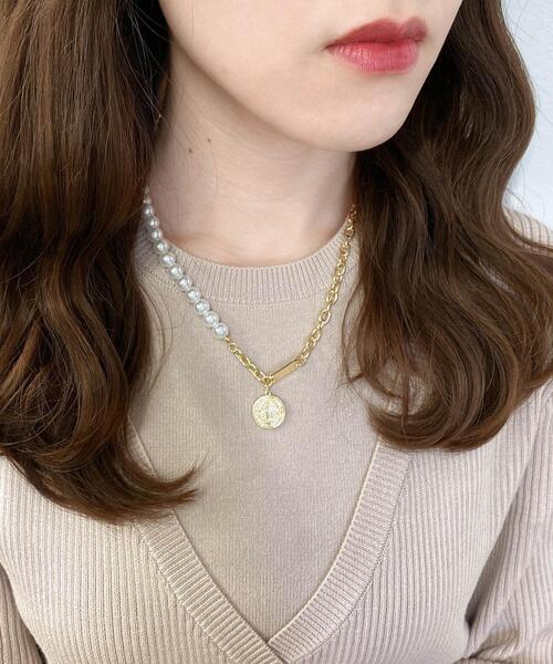 ★WEB限定アイテム★ 2022 春アイテム パールビジューとチェーンを組み合わせたリュクスな雰囲気のネックレス。コインのモチーフがアクセントになっています。首元を上品に彩る程よいボリューム感。レディライクなスタイルはもちろん、Tシャツなどに合わせたカジュアルスタイルにもおすすめ。ゴールドカラーとシルバーカラーがラインナップ。