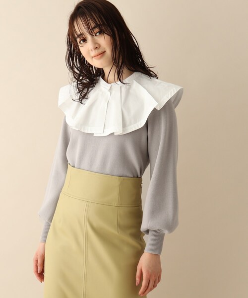 布帛の衿がついた、ドッキングデザインニット。 【素材】 コットン混のさらっとした糸をスムース編みでふんわりと仕上げた、春らしいニット。 布帛部分はコットン100の程よいハリ感がある高密度な素材感を使用しているため、フレア感が出て華やかな印象に◎ 異素材をドッキングさせることにより、トレンド感のある一着に仕上げました。 ※付け襟付き 【シルエット】 ドッキングすることにより、衿まわりを華やかに仕上げてくれるデザイン。 程よいフレア感が特徴的な衿と、ベーシックなニットのドッキングなので別々に着用できるのもポイント◎ 全体的にふんわりとしたボリューム感を意識したシルエットにおつくりしました。 【こだわり】 ドッキングして着用はもちろん、バラバラにも使える着回し力が高い一着。 デザインポイントをしっかりいれた、一枚で華やかなドッキングニットです。 マシンウォッシャブル機能つき。 こちらの商品は主に春に着用いただける商品です。 モデル情報:身長166cm B80 W58 H83 着用サイズ:38(M) 店舗へのお問い合わせ商品番号:N02-14008 ●製品寸法: 38(M):着丈51cm B92cm 袖丈56cm 肩幅32cm 付属襟全長37cm 付属襟幅20cm 備考: