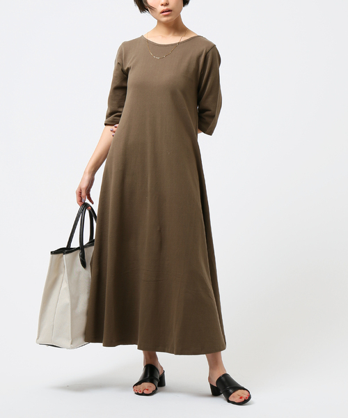 【2022SS】 B.C STOCK 後ろ姿がきれいに決まる、バックシャンのフレアワンピース。 後ろのネックラインを程よく下げたデザインが鎖骨やネックの華奢さを際立たせる、レディライクなカットワンピースです。 ソフトタッチの梨地素材を使った、体のシルエットをきれいに見せてくれる上品な一着。 フィット&フレアのデザインが女性らしさを際立たせてくれます。1枚で気軽に着られるのに品良くまとまる、大人のワードローブに欠かせないアイテムです。 ********************** 透け感:なし 裏地:なし 伸縮性:ややあり 光沢感:なし 生地の厚さ:普通 ********************** 【スタッフ着用コメント】 《スタッフ staff.s》 身長:165cm/普段サイズ:S~M/着用サイズ:フリーサイズ サイズ感:肩周りはジャストサイズ、身幅もややシェイプされたスッキリ見えのサイズ感です。 体のラインを拾うタイプのフィット感ではなく、自然と体のラインを綺麗に演出してくれるようなシルエットです◎ 素材感:表面にやや凹凸感のある綿見えの素材感です。下着の線が響きにくそうに感じたので、一枚着としてデイリーにお使い頂けそうです◎ 着心地:背中ががやや広めに空いているのがデザインポイントですが、横に広がった空きではないのでインナーのキャミソールの肩紐が出ることがありませんでした◎ 気兼ねなく普段使いしやすいリラックス感です♪ ********************** 【スタッフ着用コメント】 《スタッフasako》 年齢:30代前半/身長:153cm/体型:普通/普段サイズ: S~M/着用サイズ :フリー サイズ感:フィット&フレアのデザインがキレイなラインを出してくれるサイズ感。大きすぎず、ちょうど良かったです。ロング丈ですが、私の身長でフラットシューズで合わせても擦らずに着られました。 素材感:厚すぎず薄すぎず、透け感なく一枚で着られました。梨地の凹凸感がニュアンスのある雰囲気にしてくれます。 着心地:柔らかい素材感で、ラフな着心地。動きやすいデザインです。 ********************** ※取り扱いについては、商品についている品質表示でご確認ください。 ・この製品は色あせしますので、光の当たらない場所で乾かしたり、保管してください。 ・型崩れをさけるため、洗濯後は平干ししてください。 ・摩擦により毛羽立ちや毛玉ができることがあります。 ※店頭・屋外での撮影画像は、光の当たり具合で色味が違って見える場合があります。商品の色味は、スタジオ撮影の画像をご参照ください。 モデルサイズ:H165 採寸情報は「サイズ・詳細」をご確認ください 着用サイズ:フリー 本体:洗濯機洗い(弱)