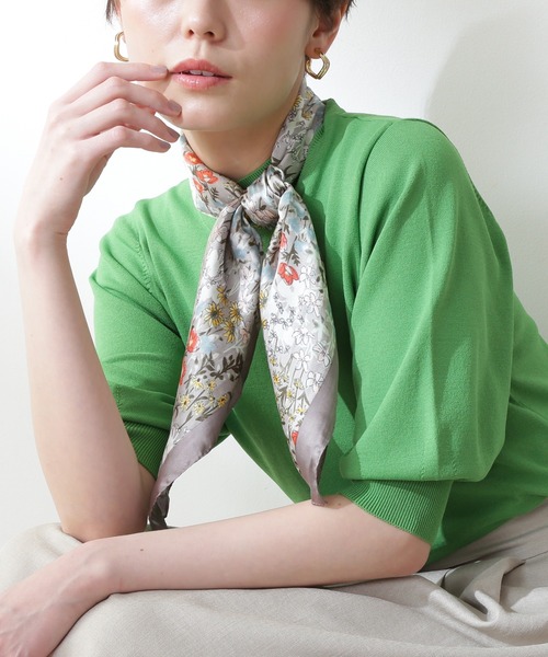 大人の女性にぴったりなヴィンテージライクな花柄スカーフ。首元に巻いたり、ヘアアクセサリーとしてや、バッグの持ち手に結んだりとお好きにアレンジできる便利なデザインです。シーズンレスで使えるポリエステル素材を使用しています。