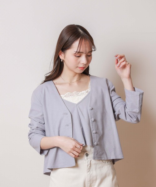 キャミとジャケットがセットになったスペシャルなトップス♪ 綿麻素材で暑い時期も涼しく着用いただけます。 セットではもちろん、それぞれ別のアイテムと組み合わせてもお使いいただける 3way仕様です。 Ivoryはjourney short pantsと合わせるとセットアップのような着こなしが 楽しめます。 ※同生地ではございません。 キャミソールはUネックとVネックの前後どちらでも着用いただける2way! 1つのアイテムでたくさんの着こなしをお楽しみいただけます。 また、ジャケットはラフな雰囲気でも楽しめるよう袖口を広めにし、 袖をまくりやすい仕様にしております。 ♡おすすめコーディネート♡ お出かけはもちろん、キレイめなアイテムと合わせてオフィスシーンにも♪ 同系色のマーメイドスカート、テーパードパンツなどすっきりしたアイテムとの スタイリングがおすすめです。 【お買い物を上手にお楽しみいただくためのPOINT2つ】 ◎ 購入ボタン横の ♡ (ハートマーク)をクリック! 完売カラーの再入荷通知、残り1点の通知、セールの通知を受け取れます。 (クリックまたはタップで商品のお気に入り登録♪) ◎ ショップのトップページにある ♡ (ハートマーク)「お気に入りショップに追加」をクリック! 新商品や再入荷等、いち早くブランドのお得な情報を受け取れます。 (ブランドのお気に入り登録♪)