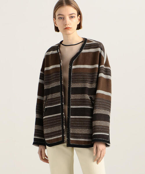 製品を作る際に出る裁断端切れを再利用したリサイクルコットンのジャカードシリーズ。絶妙な凹凸感と奥行きのある表情が魅力です。ショートコートはゆとりを持たせたスリーブとボクシーなシルエットで抜け感たっぷりのバランスに。ブラックのブレードディテールがシックかつ洗練された雰囲気を演出してくれます。身長やスタイリングを選ばないヒップまでのショート丈もポイント。プリミティブな印象なのでブラックデニムやレザー小物などシャープなアイテムを合わせた着こなしがおすすめです。ライトなアウター感覚でブリッジシーズンに活躍してくれる一着。2022SS商品店舗にお問い合わせの際は、下記の商品番号をお申し付けください。商品番号:22-08-21-08110※※お取扱い上の注意※※・ソフトでデリケートな素材を使用しています。毛玉ができやすい為、着用後はホコリをはらい、毛羽乱れを整えるブラッシングがおすすめです。取り除く場合は引っ張らず、毛玉取り器やハサミで丁寧にカットしてください。・大変デリケートな素材です。素材表面の組織・糸質などから引っ掛けやすい為、やさしいお取扱いをお願いします。