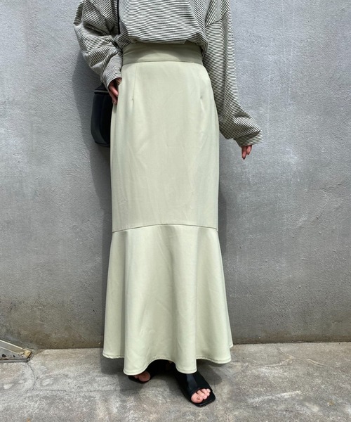 女性らしさを叶えてくれる人気のマーメイドシルエット ・着るだけで綺麗に見えるシルエット ・シワのつきにくい落ち感のある生地 ・さらりとしていて着やすい 【生地・デザイン】 ややハイウエスト設定でヒップ周りはフィットし、裾に向けてフレアを入れたマーメイドシルエット。 歩くたびにふんわりと動きがでる裾の広がり、ストレスフリーな穿き心地に欠かせないバックウエストのゴム仕様が特徴です。 一枚でも透けにくい生地感で、オールシーズン着用が可能。 さらりとした落ち感のあるカット素材で、見た目に反した気心地の良さです。 【コーディネート】 スッキリしたショート丈トップスを合わせたメリハリのある着こなしはもちろん、ゆるっとしたビッグシルエットトップスを合わせるのがオススメ◎ フリルブラウスなどを合わせてフェミニンな装いはもちろん、シーズンが進んだ夏にはノースリーブをタックインしてシンプルな組み合わせをするのも、スカートの存在感か引き立ちます。 【お買いものをよりお楽しみいただく為に!!】 ▼商品のお気に入り登録(ハートマークをクリック) お気に入りアイテムの完売カラーの再入荷通知や、ラスト1点の通知、セールの通知も受け取ることができます。 ▼ブランドのお気に入り登録 新商品や再入荷など、クーポン配布などのお得な情報を受け取ることができます。