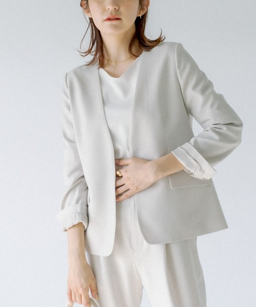 洗礼されたデザインで大人の雰囲気を演出●POINT・セットアップで着用可能・シワになりにくい素材・ストレッチが効いて動きやすい●デザイン程よいコンパクトなサイズ感のジャケット。前はフロントホックが付いたシンプルなデザインですっきりとしています。梳毛のTOPようなメランジ感にソフトな風合いのポリエステル素材を使用しています。形態回復性 があるのでしわになりにくく、ナチュラルな縦横伸びする2WAYストレッチで動きやすく着心地も抜群です。●おすすめコーディネート同素材のパンツ、スカートと合わせてセットアップとして着用いただければ、オフィススタイルから行事スタイルまで幅広く着用いただけます。いつものコーデにさっと羽織っていただければ、簡単にキレイ目コーデの完成!同素材でパンツもございます。ソフトストレッチストレートパンツ(RDZ1021202A0002)同素材でスカートもございます。ソフトストレッチタックストレートスカート(RDZ1021201A0007)●素材表地:ポリエステル 83%複合繊維(ポリエステル)17%裏地:ポリエステル 100%・シワになりにくい・ストレッチ素材==============洗濯方法:ドライクリーニング透け感:なし裏地:あり伸縮性:ややあり生地の厚さ:普通光沢:なし==============【スタッフ着用コメント】●身長:160cm 着用サイズ:F 骨格:ウェーブシンプルさが嬉しいジャケットandパンツ。上下での着用ならハンサムなスーツスタイルに。ブラウスやカットソーなどインナー次第で着回しも◎ノーカラーですっきり見えするデザインです。ストレッチ性もあるので、着心地も良く着用できます。●身長:158cm 着用サイズ:F 骨格:ウェーブ着用しているボトムとセットアップで着用できます。ノーカラーで首元がすっきりとします。丈感はヒップが少し隠れるくらいの長さです。袖にはスリットが入っているため捲りやすく、軽い印象になります◎【骨格タイプ】・ストレートタイプ全体的に筋肉質で体にメリハリがあるタイプ腰とバスト位置も高く厚みがあり、ひざ下は細目・ウェーブタイプ全体的に柔らかな曲線の体のライン重心が下半身にあり、上半身は華奢で薄い印象・ナチュラルタイプ筋肉や脂肪があまり感じられなく重心の偏りがないタイプ骨組みはしっかりしており、関節が目立ちやすい==========================【注意点】※画像の商品は光の照射や角度、お使いのモニター環境により、実物と色味が異なる場合がございます。 あらかじめご了承下さいませ。==========================【お買い物をもっと便利に楽しく♪】『♡』をクリックでお気に入り登録✓「商品のお気に入り登録」で・・・ラスト1点や再入荷の通知が届きます。登録して頂いた商品だけが対象となるあなただけのタイムセールが開催されることも!✓「ブランドのお気に入り登録」で・・・新商品や再入荷など、いち早くブランドのお得な情報を受け取ることができますので、ご登録をおすすめします!==========================