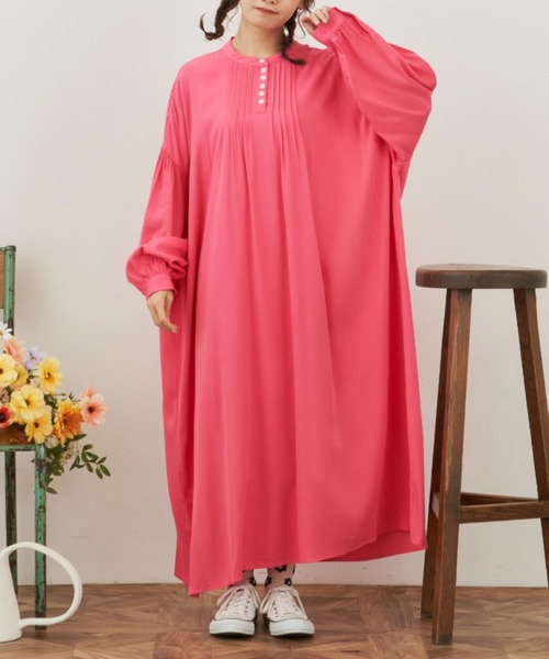 【ピンタックボリュームワンピース】ゆったりしたオーバーサイズでリラックス感たっぷりワンピース 《detail / fabric》レーヨンのしなやかさが美しいたっぷりボリュームワンピース。ゆったりしたオーバーサイズでリラックス感たっぷりなので年齢を問わずカラーアイテムを楽しめます。さらにしっかりとした素材感で透け感も少なく、落ち感がお洒落な雰囲気。胸元にあしらったタックによって美しいドレープのフレアシルエットになり、女性らしさを引き立たせたデザインです。《point》・たっぷり身幅・体型カバー力◎・春に最適な程よい厚さ・動くたび綺麗なドレープ・ボタン&タックデザイン・妊婦さんにもおすすめ《coordinate》一枚でバサッと着られて楽ちんなワンピース。冬から春への時期には前開きのベストやタートルネックなどレイヤードするのもおすすめ。ワンピースの面積が大きく一目で鮮やかな印象にしてくれます。……………………透け感 : ほぼなし厚さ:普通伸縮性:なし裏地:なしお手入れ方法 : ドライクリーニング推奨※・摩擦により他のものへ色移りすることがあるため、白・淡色との着用に注意ください。・直射日光や蛍光灯の長時間照射により、色あせすることがございます。・色移り/汗・雨に濡れると白・淡色に色移りすることがございますのでご注意ください。・つけ置き洗い・濡れたまま放置はしないでください。……………………※ご注意※・屋外の光や照明の当たり具合で、実際の商品の色味とカラー別画像の色味に若干の違いが発生する場合がございます。・詳細画像と併せてご確認の上、ご注文いただきますようお願い致します。【merlot】#カワイイはオモシロイカワイイを自分らしく楽しむ女性へユーモア&ハッピーそしてちょっぴりモードに大人の休日にとびっきり可愛くなれるお洋服を提案【商品のお気に入り登録】完売カラーの再入荷通知やラスト1点の通知、プライスダウンの通知を受け取ることが出来ます。【ブランドのお気に入り登録】新商品や再入荷など、嬉しい情報を受け取る事が出来ます。ぜひご登録ください◎