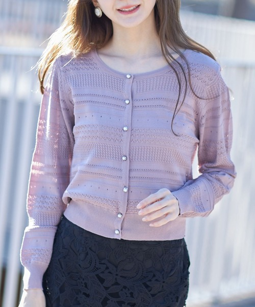 涼感たっぷりなレディルックがカギのカーディガン。 ボーダー風の透かし編みデザインで涼し気な印象をプラス。 前立てにはエレガントで上品なパール釦をON★ 羽織るのはもちろん、デザインを活かして ボタンを全て閉じてプルオーバーとして着こなすのもオススメ☆