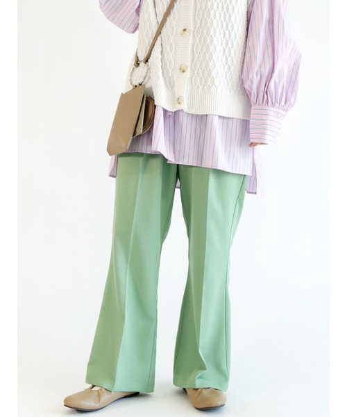センタープレス入りで、スタイリッシュな印象の裾フレアパンツ。ハイウエストの前後4つボタンにフレアシルエットが、脚長と美脚を叶えてくれます。伸縮性の高い素材に、ウエスト後ろはゴム仕様が快適な着心地に。ロングシーズン着回しできるパステルカラーな展開にも注目です。