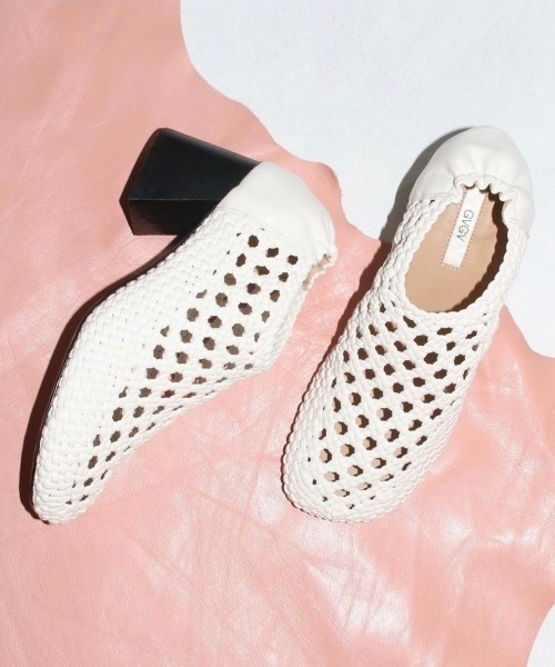 G.V.G.V. (ジーヴィ ジーヴィ)メッシュパンプス 【Fabric】 つやのある合成皮革をアッパーに使用。 【Design】 細やかに編まれたメッシュ素材が特徴的なパンプス。チャンキーヒール。 踵はゴムシャーリング付きで着脱もスムーズです。