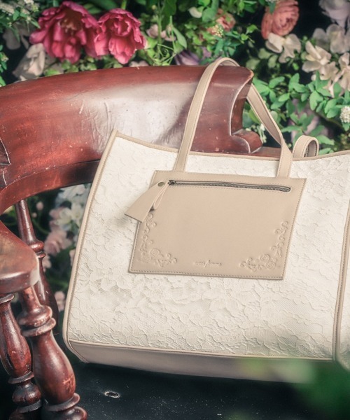 【アイテム説明】 axes femmeカタログ掲載アイテム レース柄が華やかなA4サイズのトートバッグです。 ベーシックなカラーで普段使いからお仕事使いまで◎ 両面に内ポケットが付いているので、機能性も抜群です。
