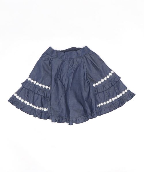 【アイテム説明】 サイドのフリル使いがとってもガーリーなデニムスカパンです。 ふんわりと広がるフリルにはお花柄レースをあしらい、axes femme kidsらしいデザインに。春夏ならではの明るく綺麗な配色使いで軽やかに仕上げました。 ウエストはすっきりとした控えめなデザインなので、甘すぎずメリハリのついたコーデが簡単に決まります♪合わせるトップスを選ばない万能アイテムなので、フェミニントップスからカジュアルTシャツまで幅広い着回しを楽しめますよ。 裏地がパンツ型になっているので、遊び盛りなお子様も安心して着られるのも嬉しいポイントです。