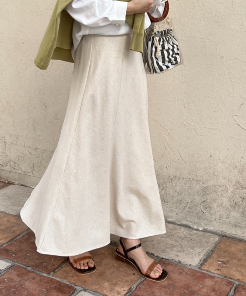 【カラースカート・リネンスカート・ロングスカート】目を惹くカラーがコーディネートのアクセントに! ■point ・ベルト部分がバイカラーになったロングスカート ・ウエストの後ろ部分はゴム仕様 ・ナチュラルカラーからパキッとカラーの4色展開 ・ストンと落ち感のあるシルエット ・緩やかなマーメイドラインがスタイル良く見せてくれる ■design ウエストが配色になったバイカラーデザインです。 麻レーヨンの混合生地なので、落ち感があり脚長効果抜群です。 はっきりとしたカラー2色(グリーン/レッド)はTシャツでシンプルに合わせるだけでも雰囲気の出る存在感あるカラー! 緩やかなマーメイドラインなので窮屈過ぎず、ストレスフリーに履いていただけます。 ■coordinate Tシャツやブラウスでシンプルに合わせても存在感あるコーディネートになります。 シャツワンピースのインナーに仕込んでレイヤードコーディネートを楽しむのも◎ -------------------------------------------------- 透け感:なし 裏地:なし 伸縮性:なし 生地の厚さ:普通 ポケット:なし 季節:春.夏.秋 洗濯方法:手洗い可 アイロンは当て布使用 -------------------------------------------------- ※商品画像は着用イメージです。 光や角度により、実物と色味が異なる場合がございます。また表示のサイズ感も実物とは若干異なる場合もございますので、ご了承ください。 ※着用、お取り扱いの際は、商品についている品質表示とアテンションタグを必ずご確認ください。 -------------------------------------------------- ♡をクリックでお得な情報をお知らせいたします。 <商品お気に入り登録> お気に入りアイテムのお値下げ・再入荷・在庫ラスト1点など通知を受けることができます。 <ブランドお気に入り登録> Chez toiの新商品・再入荷・SALE・クーポン配布などお得な情報を受けることができます。 -------------------------------------------------- リラックススタイル/ストレスフリー/オンオフ/ベーシック/デイリー/マーメイドスカート/大人カジュアル/ママコーデ/ お出かけスタイル/細見え/抜け感/キレイめ/カラースカート/ロングスカート/夏カラー/淡色/ナチュラル