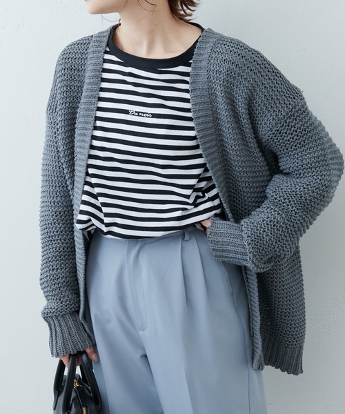 ピュアルセシン 2022 spring collection【Loose andclassical】 ◇きれいめにもカジュアルにも取り入れやすいカーディガン◇ ●デザイン ボタンレスで気軽に羽織れるニットカーディガン。 リリーヤーンのさりげない透け感が女性らしいさを演出。 お尻が隠れるロング丈ですが、バッグをVラインにすることで抜け感のある着こなしになります。 Tシャツやブラウスに合わせるだけで デイリーコーディネートをブラッシュアップしてくれるアイテムです。 ●カラー展開 春らしい淡いアイボリー/ベージュ/グレーの3色展開。 ●素材 コットン100%のリリーヤーンを使用。 ドライな肌触りなので季節の変わり目に重宝します。 ●スタイリング ワイドパンツやロングスカート、キャミワンピースの上に合わせて こなれ感のある着こなしが楽しめます。 トップスにはラフにTシャツやフェミニンなブラウスなど どんなアイテムにも相性が良くアウター感覚でも着用できます。 =============================== 透け感:あり 裏地:なし 伸縮性:あり 光沢感:なし 生地の厚さ:普通 【スタッフコメント】 年齢:20代半ば/身長:154cm/普段着用サイズ:Mサイズ サイズ感:お尻が隠れる長めの着丈ですが、袖はスッキリとしているので着ぶくれせずに着れます。 素材感:春らしいドライタッチな肌触りで快適な着心地です。 =============================== ※撮影場所やお使いのモニター環境により若干お色味が異なる場合がございます。特にロケの撮影では明るく見える傾向にございます。 ※予約商品はサンプルで撮影をしております。若干の仕様が変更になる場合がございますので予めご了承の上ご注文くださいますようお願いいたします 。