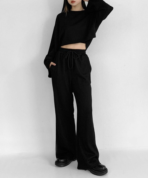 ワンランク上のカジュアルコーデが叶う♪リブ素材のクロップドセットアップ カジュアルコーデに欠かせないセットアップは、ハリ感のあるリブ素材がスタイリッシュに見せてくれます。 トップスは短めのクロップド丈。ロングスリーブに広がった袖口のデザインがポイント!! パンツはウエストゴム仕様でノンストレスな履き心地。 単品使いもでき、幅ひろい着こなしを楽しんでいただけます。 ※着用環境や条件により稀に色移りすることがございますので淡色のものをご着用の際はご注意ください。 ▼LVEU./ラブユ シンプル×モノトーンをベースにモードなデザイン性をプラス。 トレンドを意識したモノトーンの世界観を発信するモードカジュアルブランド。